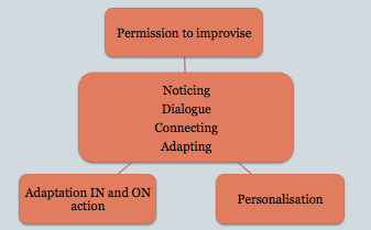 The teacher decided to give herself permission to improvise, and in doing this she adopted an improvisation mindset. Intuitively she drew upon four skills that are central to improvisational practice: these are the skills of noticing, adapting, creating dialogue and making connections.